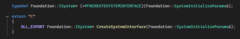 CryEngine uses the library as the main entrance point, and it looks a little different for Editor and Game, but that’s out of the scope for now. How can we load our main module - the Platform? That module is completely isolated, all we know is the name of the procedure - CreateSystemInterface. And this API is declared in the Foundation (that makes sense, we should know the type of the call), while the implementation is in the Platform.dll