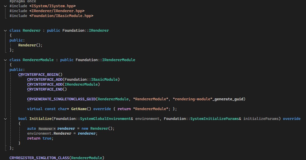 Let’s check how the renderer module is implemented: The renderer is a simple mock class, but we want to register it in the engine, so we can create it at runtime. For this, CryEngine provides the Foundation::IRendererModule interface and the Compositional Generators. So you don’t have to write a lot of the code, just add a few macroses (more details later) and override 2 methods - GetName() and Initialize(). All modules follow this interface.