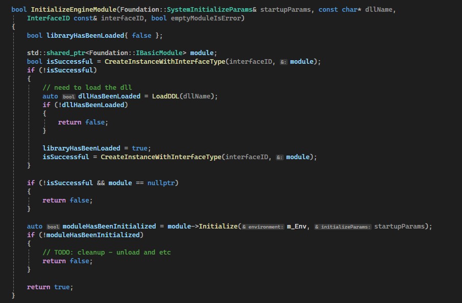 If you try to run the code right now, you will be surprised, because the code compiles, but you don’t have the Initialize call. And the issue is in the missed <Foundation/Module_impl.hpp> header. That’s the main implementation, you have to add this to the renderer.cpp file, or guarantee one entry. After this, we are able to use the module at runtime. The actual registration is skipped - I will come back to this at the end.