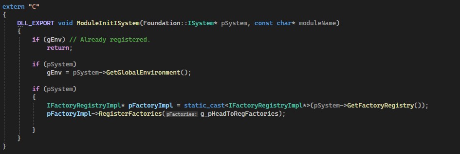Why we should add that <Foundation/Module_impl.hpp> header? Because of the way CryEngine implements the factories registration, that’s to be clear, the amazing code. The great usage of the typelist and code generators, so be sure to check the code.