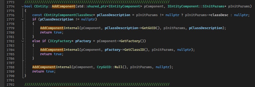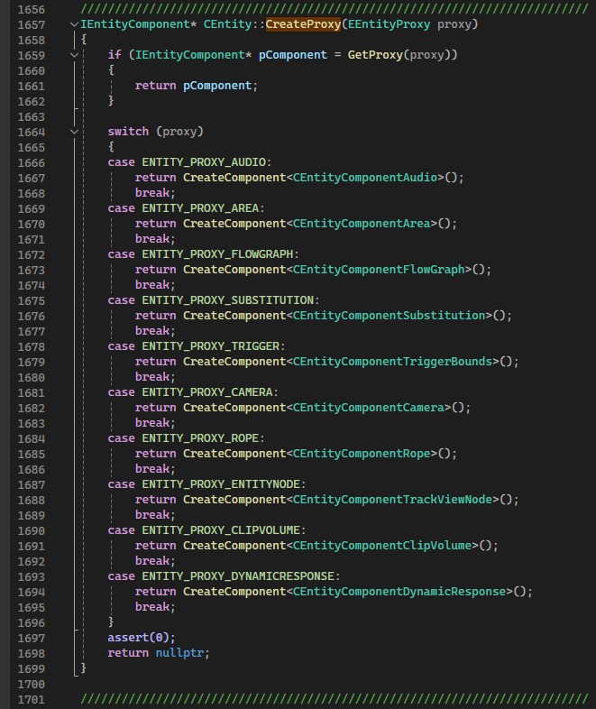 Let’s take a look at the Entity class. When CE creates a new one, it receives Entity class and Archetype in the PreInit call, this call also will create Proxy if needed (the call will take it from the Class). The next call is the Init, inside it casts Class to CEntityClass, and tries to serialize if XML exists. Serialize will call LoadComponent. CEntity has CreateProxy method which can create different components like CEntityComponentAudio, CEntityComponentArea, CEntityComponentCamera etc