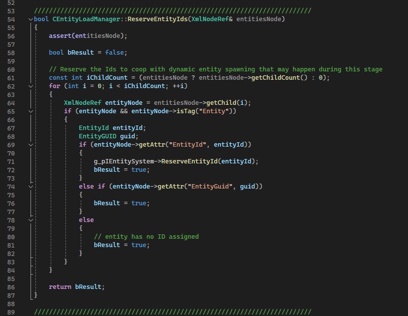 It’s getting XML as an argument, and will reserve the entities’ ids - simple iteration on the XML and parsing the id - if the id and tag are valid - we ask IEntitySystem to reserve the id. Next CE starts batch creation - the code is really self-explanatory