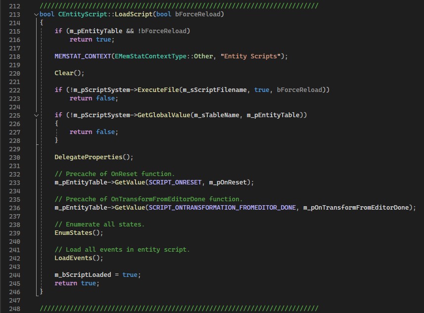 The first method that takes our attention in CEntityClass is the LoadScript. If the CEntityScript member is not null CE will try to load the script. Seems like CEntityScript is optional, so there exists a SetEntityScript call. The class also has GetEventInfo call, which will extract the vent from the CEntityScript member.
