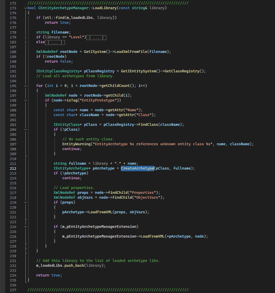 LoadLibrary is pretty straightforward - load XML by the library name (CE constructs it from the archetype name). Get the СlassRegistry from g_pIEntitySystem. Next CE will be iterating on the XML, will try to extract the Name and Class, check if it’s in the registry, and will create a new archetype withthe CreateArchetype call. And will add the library to the cache at the end of the call.