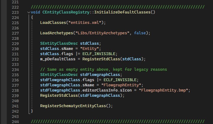Let’s check the new discovery - CEntityClassRegistry. It has a few interesting calls, let’s check the first one RegisterEntityClass. It gets the Class as an argument and will be storing the class in the map by the guid. FindClass/FindClassByGUID - simple search. RegisterStdClass will create a new CEntityClass instance, if passed as an argument descriptor have the script file - CE will load the CEntityScript and will set it to the CEntityClass instance. At the end, we have a RegisterEntityClass call.