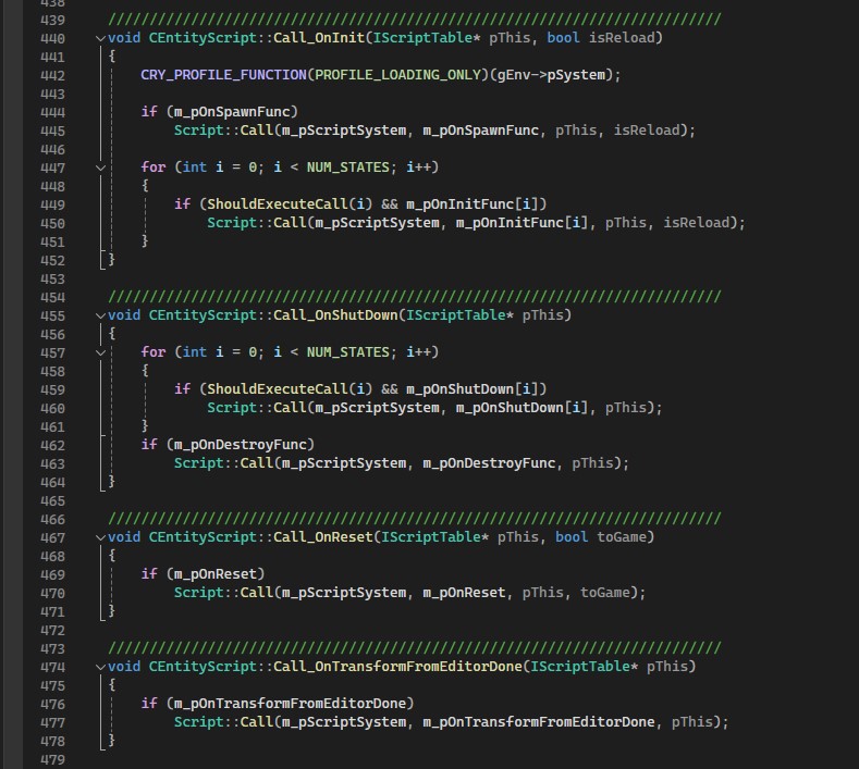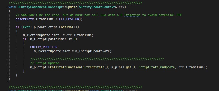 The last Script we will check is the CEntityComponentLuaScript, it stores a pointer to CEntityScript. This class also can create ScriptTable, this class is interesting because it shows some internal Lua work, for example, it works directly with “__this” and to ScriptHandle as well as “id” and “class”. This class has an Update call, but it checks the time difference, if we have enough span - we call CallStateFunction on the CEntityScript object.