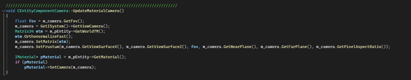 CEntityComponentCamera is another interesting but marked as a legacy component, UpdateMaterialCamera is probably the most interesting call here.