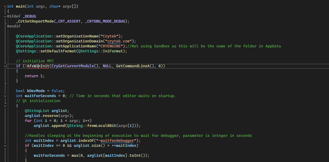 So the first thing I always want to know - is the entry point, that’s pretty easy to find, but a more interesting fact is CRYTEK uses Qt (that’s an amazing framework, I have worked with it for a few years, if you never heard about this and you are C++ dev, be sure to check it out).