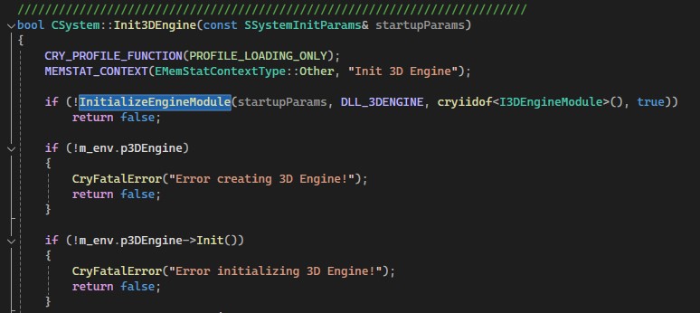 CryEngine uses really interesting architecture for modules, they load DLLs for every feature they need. That’s similar to Unity’s subsystem (if you are familiar with it) and probably a very common technique, but I have never seen this outside of my Unity projects. CrySystem is the main point for the modules loading process, method Initialize loads everyone - you can find them as InitRenderer, initMetwork, InitInput, Init3DEngine etc but all of those calls use InitializeEngineModule call inside.